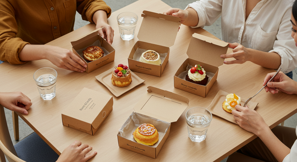 디저트포장용기는 사용 목적과 제품 특성에 따라 다양하게 선택할 수 있다. 펄프나 종이 소재는 친환경적이며, 크라프트 용기는 내구성과 자연스러운 질감을 제공한다. 플라스틱과 알루미늄 용기는 보관성과 내열성이 필요한 상황에서 유용하다. 또한 종이 소재 용기에는 로고나 문구를 인쇄할 수 있어 브랜드 이미지를 강화할 수 있으며, 함께 사용하는 비닐 또는 종이봉투에도 역시 소량인쇄를 이용해 브랜드 로고나 문구를 적용하면 매장만의 아이덴티티를 더욱 선명하게 드러낼 수 있다. 이는 고객에게 일관된 경험을 제공함과 동시에 브랜드 가치를 높이는 효과적인 방법이 된다.