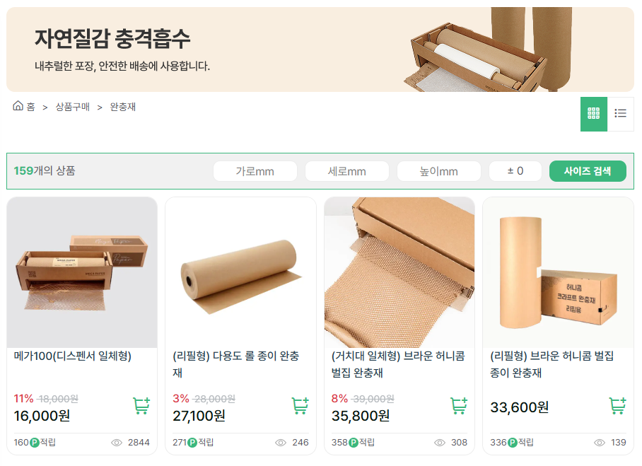 - 종이 기반 완충재: 벌집형 종이, 크라프트 완충재, 종이난좌, 화지(흰색 속지), 노루지 등은 재활용이 쉽고, 파지나 리필 형태로도 제공된다.