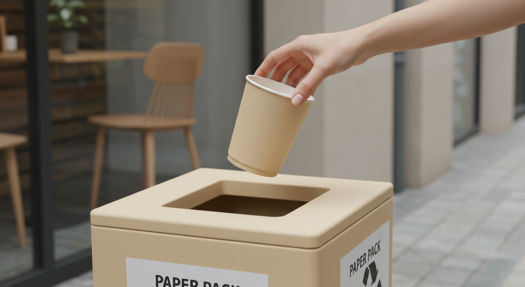 친환경종이컵은 종이팩류로 분류되어 재활용이 가능하다. 특히 대나무 종이컵은 별도의 분리 작업 없이 종이팩류로 배출하면 되고, PLA 코팅 역시 생분해되어 재활용 공정에 방해되지 않는다.